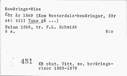 //// Bewärings=Wisa //// för år 1869 (Kom Westerdals=bewäringar, för att till Tuna gå ...) //// Falun 1869, tr. F.L. Schmidt 4 s. 8:o //// 451 KB 0kat. vitt. 3v. bevärings- //// visor 1800-1879 ////
