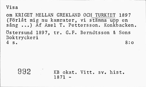 //// Visa //// om KRIGET MELLAN GREKLAND OCH TURKIET 189 7 (Förlåt mig nu kamrater, vi stämma upp en sång ..,.) Af Axel T. Pettersson. Konkbacken. //// Östersund 1897, tr. G.F. Berndtsson & Sons Boktryckeri //// 4 s. 8: o //// 992 KB okat. Vitt. sv. hist. //// 1871 - ////