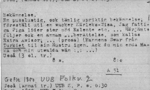 //// Bekännelse, //// En puoslustig, o »V tänlig upriktir bekänrel* e, föreställ uti en wacker Kärlekssa, Jag fattiga Piga lider stor nöd Exler.t* etc. ... Härjämts följer osk en annan .»..berättelse, 30m kallas Extra hwisor; ... (prosa) (Mannens Swar från Turkiet til sin Hustru igen. Ack iu min enda Ma-ka och min uteaida wän ...) //// "J9ok (3 el. tr.) //// 8 s, 8:o //// k 51 //// G-eFle. \ %<h V DB .Pol k* //// Jooå (annat tr.) UUB %.. ?. s. 6:30 ////