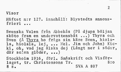 //// 2 //// Visor //// Häftet n:r 127. innehåll: Blystedts annonsfrieri ... //// Svenska Valen från Abbekås (På djupa böljan sköto fram en undervattensbåt ...) Thyra och Sven (A Thvra ho fråga sin käre Sven, hiola-la, hiolala, lej, Mel. Jim och John) Kicki, oh, vad jag älska dej (Långt ner i söder, där solen glöder, ...) //// Stockholm 1916, förl. Småskrift och Vis förlaget, tr. Christensons Tr. S:o 8 s. SVA A 807 ////