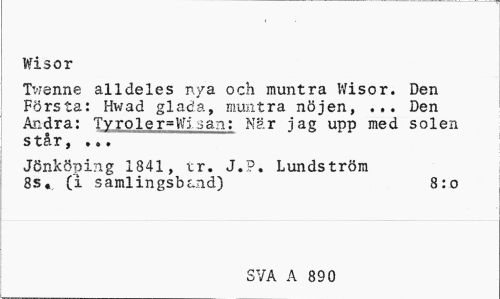 //// Wisor //// Tweime alldeles nya och muntra Wisor. Den Första: Hwad glada, muntra nöjen, ... Den Andra: Tvroler=Wijan: När jag upp med solen star, »o • //// Jönköping 1841, tr. J.P. Lundström //// 8s«, (i samlingsb£.nd) 8:0 //// SVA A 890 ////