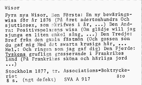 //// Wisor //// Fyra nya Wisor. Den Första: En ny bewärings-wisa för år 1876 (På året adertonhundra Och sjuttiosex, som skrifwes i år, ,..) Den Andra: Positivspelarens wisa (Om glädje will jag sjunga en liten enkel sång, ,..) Den Tredje: Bref från den gamla fästmön (Och gossen som du gaf mig Med det swarta krusiga hår, ... Mel.: Och ringen som jag gaf dig) Den Fjerde: Tyskens grufliga grasserande i Frankrikes land (På Frankrikes sköna och härliga jord //// Stockholm 1877, tr. Associations*Boktrycke- //// riet s*o //// 8 s. (ngt defekt) SVA A 917 ////