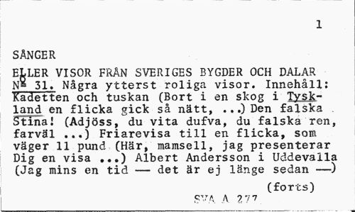 //// 1 //// SÅNGER //// ELLER VISOR FRÄN SVERIGES BYGDER OCH DALAR N- 31» Några ytterst roliga visor. Innehåll: Kadetten och tuskan (Bort i en skog i Tysk-land en flicka gick så nätt, ...) Den falska Stina! (Adjöss, du vita dufva, du falska ren, farväl ...) Friarevisa till en flicka» som väger 11 pund (Här, mamsell, jag presenterar Dig en visa ...) Albert Andersson i Uddevalla (Jag mins en tid — det är ej länge sedan —) //// (forts) //// £YA A 2 7 7 ////