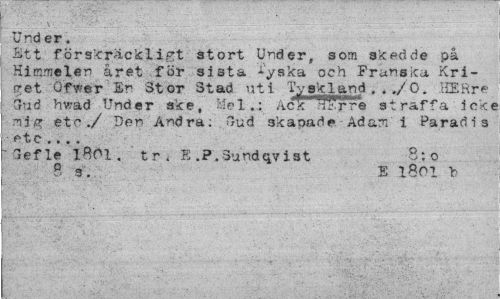 //// Und er. //// Ett förskräckligt stort Under, som skedde på Himmelen året för sista 1yska och Franska Kri-<?et öftfer En Stor Stad uti Tyskland./O. HERre Gr ti d hvad Under eke, Mel,; Ack ffirre straffa icke mi<? etn ./ Den Andra: Gud skapade Adam i Parad i s etc ... //// -"ef le 1^01. tr, E .P. 3undqv i st 8:0 //// 8 a". E 1B01 b ////