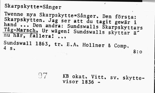 //// Skarpskytte=Sånger //// Twenne nya Skarpskytte»Sånger. Den första: Skarpskytten. Jag ser att du tagit gewär i hand ... Den andra: Sundswalls Skarpskyttars Tåg-Marsch. Ur wägenJ Sundswalls skyttar ä* nu Mr, faileral ... //// Sundswall 1863, tr, E.A% Hollner & Comp, 4 s. 8:0 //// KB okat* Vitt, sv. skytte- //// visor 1836 - ////