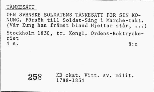 //// TÄNKESÄTT //// DEN SVENSKE SOLDATENS TÄNKESÄTT FÖR SIN KONUNG. Försök till Soldat-Sång i Marche-takt. (Vår Kung han främst bland Hjeltar står, ...) //// Stockholm 1830, tr. Kongl. Ordens-Boktryckeriet //// 4 s. 8:0 //// OCO KB okat. Vitt. sv. milit. //// ÄUO 1788-1834 ////