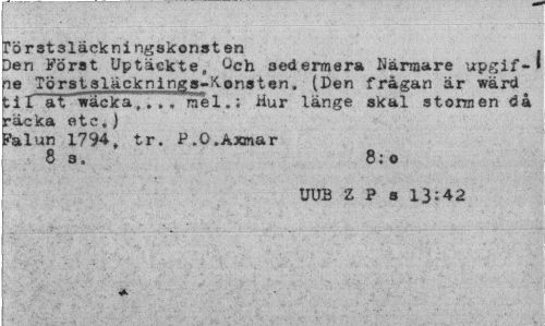 //// rörst3lackningakonsten . //// Den Förat Uptäckte» Och 3edermera Närmare urpgif- » ne Törstaläckninffs-Konsten. (Den frågan är wärd t i r~äT^wäcka7 . . , me 1. *. Hur länge skal stormen då räcka etc,) //// Falun 1794, tr. P.O.Aznar //// 8a. 8:o //// UUB Z P s 13:42 ////