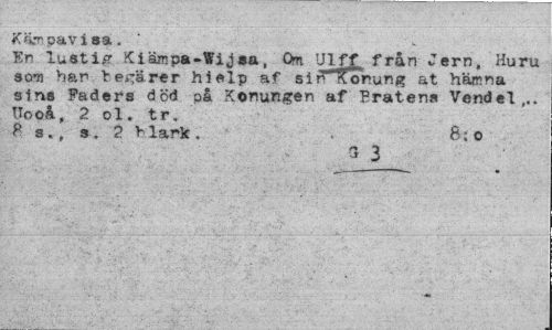 //// Kämpåvisa. //// En lustig Kiämpa-Wijaa, Om Ulff från Jern, Huru som han Vega re r hielp af si-tr-Konung at hämna sins Faders död på Konungen af Bratena Vendel,,. Uooå, 2 ol. tr. //// P s., s. 2 Mark, . 8:0 //// 3 3 ////