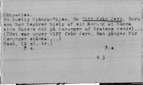 //// i Kampavi»a. //// En lustig Kiänpa-^ijaa, Om r'i f-f fr|n Jem Huru i som han begärsr hielp af sin Konung at hämna sina Faders död på Konu^en af Bråtens vendel,. (THet war unger '*»lff från Jern, Han gånger för Konungen stånda; . ,.) U*oå, (2 ©1. tr.) //// 5 s, e //// G 3 ////