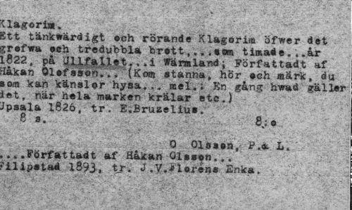 //// Uagori». . ¦ //// Ett tänkwärdigt •ch rörande Klagori» öfwer det jrefwa och tredubbla br«tt,...«o» t imaé e . .. år LÖ22 oå aiifaUet. , .i Wanaland; Författadt af Håkan Olofason... (Kom stanna, hör#och märk, du som kan känslor hysa... mel.; Rn gång hwad galler let, när hela marken krälar etc.) Jpsala 1826, tr. E;Bruaellu«. //// 8 s. //// 0 01s»»n, L. //// ,.,.Författadt af Håkan Olsson... ?ilip«tad 1893, tr. J.V.Al©rens Snk». ////