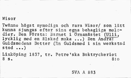 //// Wisor //// Twäxine högst nymodiga och rara Wisor/ som lätt kunna sjungas efter sina egna behagliga melodier, Den Första: Barnet i Örnanästet (Ulli, lycklig med en älskad maka ,..) Den Andra: Guldsmedens Dotter (En Guldsmed i sin werkstad s tod .•,) //// Linköping 1837, tr. Petre'ska Boktryckeriet 8 s. 8:0 //// SVA A 8 83 ////