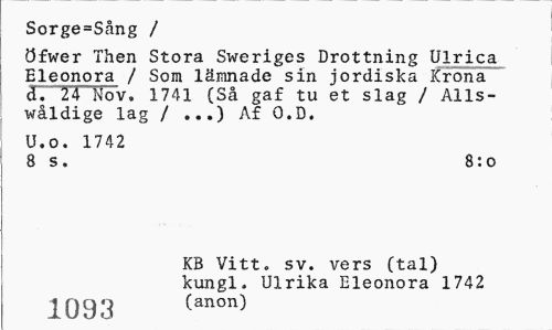 //// Sorge=Sång / //// Öfwer Then Stora Sweriges Drottning Ulrica Eleonora / Som lämnade sin jordiska Krona cl. 24 Nov. 1741 (Så gaf tu et slag / Alls-wåldige lag / ...) Af O.D. //// U.o. 1742 //// 8 s. 8:o //// KB Vitt. sv. vers (tal) kungl. Ulrika Eleonora 1742 //// 1093 (anon) ////