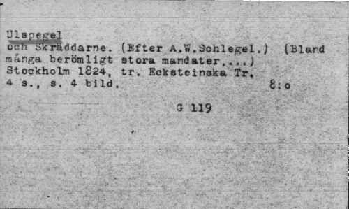 //// Ulapegel : //// ocfi^råddarne. (Efter A.S.Schlegel.) (Bland många berömligt atora mardater,.,.) Stockholm 1Ö24, tr. Ecketeinska Tr. * s., i. 4 bild. 8;o //// 3 119 //// . ' . - v..'.; • -"¦ - ¦ . . . ''- ; ////