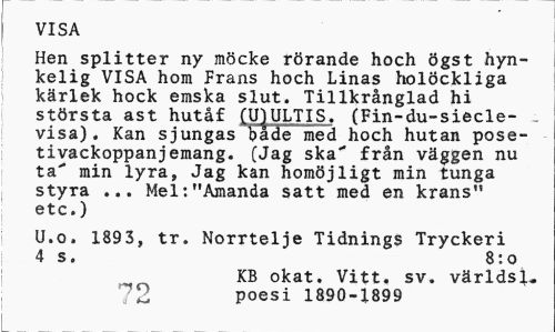 //// VISA //// Hen splitter ny möcke rörande hoch ögst hyn-kelig VISA hom Frans hoch Linas holöckliga kärlek hock emska slut. Tillkrånglad hi största ast hutåf (UJULTIS. (Fin-du-siecle- _ visa). Kan sjungas bade med hoch hutan pose-tivackoppanjemang. (Jag ska" från väggen nu ta" min lyra, Jag kan homöjligt min tunga styra ... Mel:"Amanda satt med en krans" etc.) //// U.o. 1893, tr. Norrtelje Tidnings Tryckeri 4 s. 8:0 //// KB okat. Vitt. sv. världsl, 72 poesi 1890-1899 ////