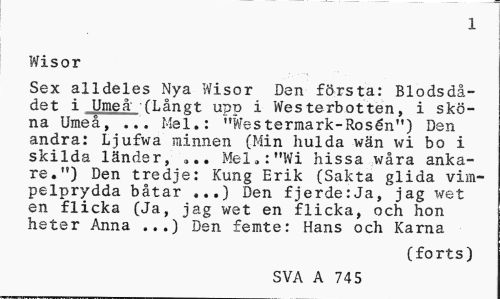 //// 1 //// Wisor //// Sex alldeles Nya Wisor Den första: Blodsdådet i Umeå ("Långt upp i Westerbotten, i sköna Umeå, ... Mel.: "Westermark-Rosén") Den andra: Ljufwa minnen (Min hulda wän wi bo i skilda länder, ».. Mel»:"Wi hissa wåra ankare.") Den tredje: Kung Erik (Sakta glida vimpelprydda båtar ...) Den fjerde:Ja, jag wet en flicka (Ja, jag wet en flicka, och hon heter Anna ...) Den femte: Hans och Karna //// (forts) //// SVA A 745 ////