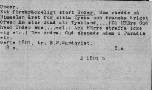 //// Jnder. //// Ett förakräclceligt stort Under, Som skedde pa Himmelen året för sista fy ska och Franska Kriget Ofwer En »tor Sta* uti Tyskland,...(01 HERre Gud hwad Under ske,. , .mel.: Ack HErre straffa icke T!ig etc.) Den Andra: Gud skapade Adam i Paradis etc. //// G-fle 1801, tr. E,P.Sundqvist . //// 8 s. .8:0 //// E 1801 t) ////
