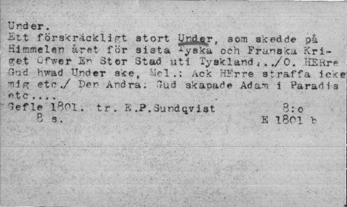 //// Under. //// Ett förskräckligt stort Upd.e_r. som skedde på Himmelen året för sista -'-yska och Franska. Kriget Of ver En Stor 3tad uti Tyskland « . ./O. HERre Gud hwad Under ske. Mel.: Ack HErre straffa icke -nig etc./ Den Andra; Gud skapade Adam i Parad i-s <^tc ... //// Gefle l801. tr. E .P.äundqvist 3: o //// 3g. E 1801 b ////