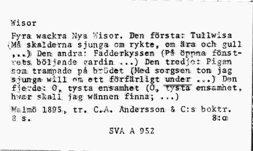 //// Wisor //// Fyra wackra Nya Wisor. Ben förstår Tullwisa vMå skalderna sjunga om rykte, om ära och gull Beifc andra; Fadderkyssen (H öppna- föast» reifrs; böljande gardin ,..) Den tredje:: Pigan som; trampade på brödet (Me*i sorgsen ton jag sjunga' will nm ett förfärligt under . o.) Den f'7e vde: O, tysta ensamhet (0, f'/5ta ensamhet, h/ar skall jag wännen finna; ...) //// Malmö 18-95;,. tr. G.A. Andersson C:s boktr. 8 s . 8i: cd //// SVA A 952 ////