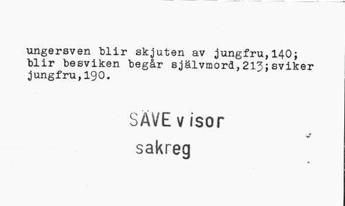 //// ungersven "blir skjuten av jungfru, 140; blir besviken begår självmora,213;sviker jungfru,190. //// SÅVE v isor sakreg ////