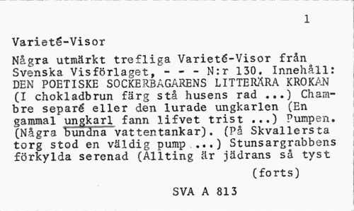 //// 1 //// VarietS-Visor //// Några utmärkt trefliga Varieté-Visor från Svenska Visförlaget, - - - N:r 130. Innehåll: DEN POETISKE SOCKERBAGARENS LITTERÄRA KROKAN (I chokladbrun färg stå husens rad ...) Cham-bre separé eller den lurade ungkarlen (En gammal ungkarl fann lifvet trist ...) Pumpen. (Några bundna vattentankar). (På Skvallersta torg stod en väldig pump,...) Stunsargrabbens förkylda serenad (Allting är jädrans så tyst //// (forts) //// SVA A 813 ////