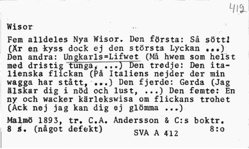 //// Lll% //// Wisor //// Fem alldeles Nya Wisor. Den första: Så sötti (Är en kyss dock ej den största Lyckan ? *.) Den andra: Ungkarls-Lifwet (Må hwem som helst med dristig tunga, .,.) Den tredje: Den italienska flickan (På Italiens nejder der min wagga har stått, •».) Den fjerde: Gerda (Jag älskar dig i nöd och lust, ...) Den femte: En ny och wacker kärlekswisa om flickans trohet (Ack nej jag kan dig ej glömma ..?) //// Malmö 1893, tr. C.A. Andersson & C:s boktr. 8 6. (något defekt) SVA A 412 8:o ////