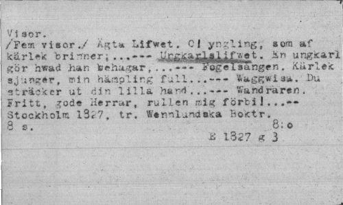 //// Visor. //// /Fem visar./ Agta Lifwet. 01 yngling, som af //// kärlek fcri-rner; ...---.jJx^^aiLl^^f-Aet. Än ungkarl //// gör hwad han kehagar.. ? - Fog el sange n. Kurlek sjunger, min häraplir.g full... — - Waggwlsa. Du //// sträcker ut din lilla hand...---'.Vandraren, //// Fritt, gode Herrar, rullen mig förbi]...»-Stockholm 13*7, tr, Wennlundska Bosctr. 8 s. 8:0 //// B 1327 g 3 ////