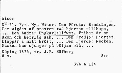 //// Wisor //// N- 21. Fyra Nya Wisor. Den Första: Brudsängen. Der wigdes af presten twå hjertan tillhopa, ... Den Andra: Ungkarlslifwet. Frihet är en skön och herrlig fa^T™... Den Tredje: Hjertat klappar i mitt bröst, ... Den Fjerde: Näcken. Näcken han sjunger på böljan blå, ... //// Köping 1876, tr. J.F.. Säfberg 8 s. 8:o //// SVA A 124 ////