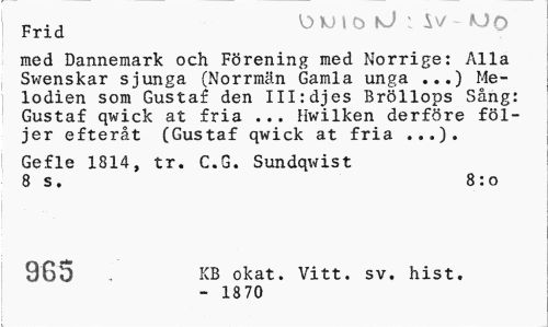 //// Frid O KM o k) : ^V uo //// med Dannemark och Förening med Norrige: Alla Swenskar sjunga (Norrmän Gamla unga ...) Melodien som Gustaf den III:djes Bröllops Sång: Gustaf qwick at fria ... Hwilken derföre följer efteråt (Gustaf qwick at fria ...). //// Gefle 1814, tr. C.G. Sundqwist 8 s. 8:0 //// 965 , KB okat. Vitt. sv. hist. //// - 1870 ////