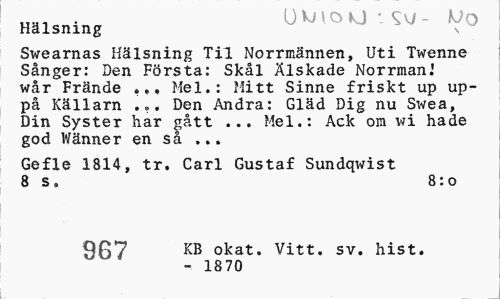 //// Hälsning UVMOO-.SW- U0 //// Swearnas Hälsning Til Norrmännen, Uti Twenne Sånger: Den Första: Skål Älskade Norrman.1 wår Frände ... Mel.: Mitt Sinne friskt up up-på Källarn ... Den Andra: Gläd Dig nu Swea, Din Syster har gått ... Mel.: Ack om wi hade god Wänner en så ... //// Gefle 1814, tr. Carl Gustaf Sundqwist 8 s. 8:o //// 965 , KB okat. Vitt. sv. hist. //// - 1870 ////