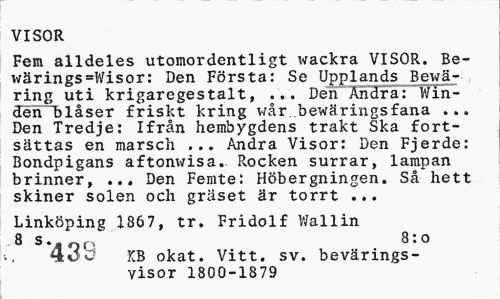 //// VISOR //// Fem alldeles utomordentligt wackra VISOR. Be-wärings=Wisor: Den Första: Se Upplands Bewä- , ring uti krigaregestalt, ... Den Andra: Win-den blåser friskt kring wår bewäringsfana ... Den Tredje: Ifrån hembygdens trakt Ska fortsättas en marsch ... Andra Visor: Den Fjerde: Bondpigans aftonwisa. Rocken surrar, lampan brinner, ... Den Femte: Höbergningen. Så hett skiner solen och gräset är torrt ... //// Linköping 1367, tr. Fridolf Wallin 8 s. _ Q, 8:0 //// **C<3 KB okat. Vitt. sv. bevärings-yisor 1800-1879 ////