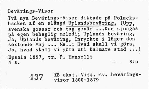 //// Bevärings-Visor //// Två nya Bevärings-Visor diktade på Polacksbacken af en slängd Uplandsbeväring. (Upp, svenska gossar och tag gevär ...Kan sjungas på egen behaglig melodi; Uplands beväring, Ja, Uplands beväring, Inryckte i läger den sextonde Maj ... Mel.: Hvad skall vi göra, Ja, hvad skall vi göra uti Kalmare stad ...) //// Upsala 1867, tr. P. Hanselli 4 s. 8:0 //// J 07 KB okat. Vitt. sv, bevärings- //// visor 1800-1879 ////