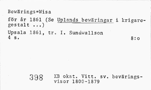 //// Bewärings=Wisa //// för år 1861 (Se Uplands bewäringar i krigaregestalt . ®.) //// Upsala 1861, tr, I. Sundwallson 4 s. 8: o //// r3qO KB okat. Vitt, sv. bevärings- //// UlJO visor 1800-1879 ////