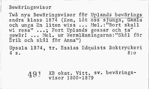 //// Bewä r ingswisor //// Twå nya Bewäringswisor för Uplands bevärings andra klass 1874 (Kom, låt oss sjunga, Gamla och unga En liten wisa ... Mel.:"Bort skall wi resa" ...; Fort Uplands gossar och ta" gewär! ... Mel. ur Wermlänningarna:"Skål för Erik och skål för Anna") //// Upsala 1874, tr. Esaias Edquists Boktryckeri 4 s. 8: o //// <iqi KB okat. Vitt. sv. bevärings- //// ^ visor 1800-1879 ////