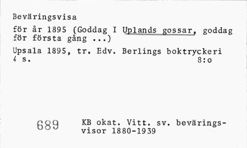 //// Beväringsvisa //// för år 1895 (Goddag I Uplands gossar, goddag för första gång ...) //// Upsala 1895, tr. Edv. Berlings boktryckeri 4 s. 8:o //// 649 KB okat. Vitt. sv. bevärings- //// visor 1880-1939 ////