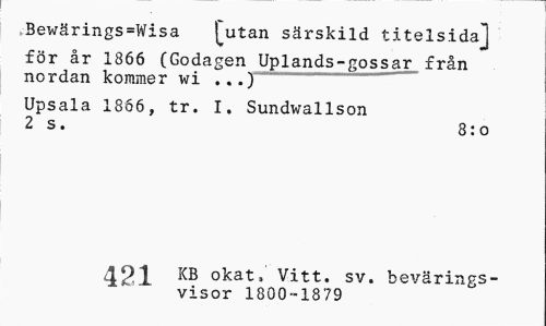 //// Bewärings=Wisa j~utan särskild titelsidaj //// för år 1866 (Godagen Uplands-gossar från nordan kommer wi ...) //// Upsala 1866, tr. I. Sundwallson 2 s. 8:o //// Qqp KB okat. Vitt. sv. bevärings- //// ^ visor 1800-1879 ////