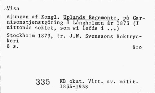 //// Visa //// sjungen af Kongl. Uplands Regemente, på Gar-nisonstjenstgöring å Långholmen år 1873 (I nittonde seklet, som wi lefde i ...) //// Stockholm 1873, tr. J.W. Svenssons Boktryckeri //// 8 s. 8:o //// KB okat. Vitt. sv. milit. //// 1835-1938 ////