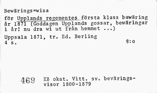 //// Bewärings=wisa //// för Upplands regementes första klass beväring år 1871 (Goddagen Upplands gossar, bewäringar i årl nu dra wi ut från hemmet ...) //// Uppsala 1871, tr. Ed. Berling 4 s. //// Qqp KB okat. Vitt. sv. bevärings- //// ^ visor 1800-1879 ////