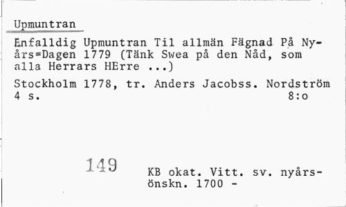//// Upmuntran //// Enfalldig Upmuntran Til allmän Fägnad På Ny-års=Dagen 1779 (Tänk Swea på den Nåd, som alla Herrars HErre ...) //// Stockholm 1778, tr. Anders Jacobss. Nordström 4 s. 8:o //// 149 //// ' u KB okat. Vitt. sv. nyårs- //// önskn. 1700 - ////