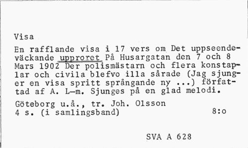 //// Visa //// En rafflande visa i 17 vers om Det uppseendeväckande upproret På Husargatan den 7 och 8 Mars 1902 Der polismästarn och flera konstaplar och civila blefvo illa sårade (Jag sjunger en visa spritt språngande ny ...) författad af A. L—m. Sjunges på en glad melodi. //// Göteborg u.å., tr. Joh. Olsson 4 s. (i samlingsband) 8:o //// | SVA A 628 ////