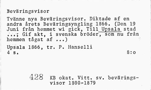 //// Beväringsvisor //// Tvänne nya Beväringsvisor. Diktade af en andra årets Beväringsyngling 1866, (Den 19 Juni från hemmet wi gick, Till Upsala stad .'..; Gif akt, i svenska bröder, som nu från hemmen tågat af ...) //// Upsala 1866, tr. P. Hanselli 4 s. 8: o //// 428 KB okat. Vitt. sv. bevärings- //// visor 1800-1879 ////
