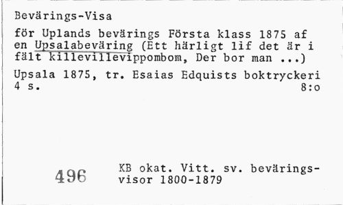 //// Bevärings-Visa //// för Uplands bevärings Första klass 1875 af en Upsalabeväring (Ett härligt lif det är i fält killevillevippombom, Der bor man ...) //// Upsala 1875, tr, Esaias Edquists boktryckeri 4 s. 8: o //// - f n KB okat. Vitt. sv. bevärings- //// 4^0 visor 1800-1879 ////