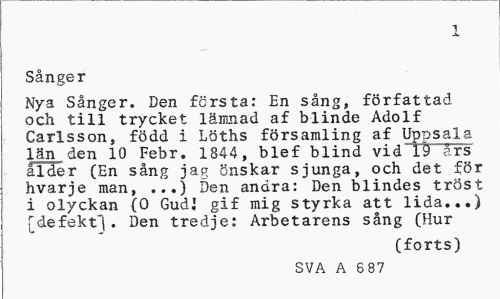 //// 1 //// Sånger //// Nya Sånger. Den första: En sång, författad och till trycket lämnad af blinde Adolf Carlsson, född i Löths församling af Uppsala län den 10 Febr. 1844, blef blind vid 19 ärs ålder (En sång jag önskar sjunga, och det för hvarje man, ...) Den andra: Den blindes tröst i olyckan (0 GudJ gif mig styrka att lida...) [defekt^. Den tredje: Arbetarens sång (Hur //// (forts) //// SVA A 687 ////