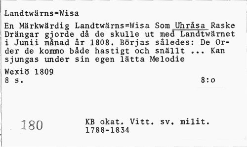 //// Landtwärns=Wisa //// En Märkwärdig Landtwärns=Wisa Som Uhråsa Raske Drängar gjorde då de skulle ut med Landtwärnet i Junii månad år 1808. Börjas således: De Order de kommo både hastigt och snällt ... Kan sjungas under sin egen lätta Melodie //// Wexiö 1809 //// 8 s. 8:o //// i on KB okat. Vitt. sv, milit. //// J OU 1788-1834 ////