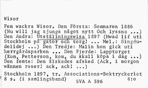 //// Wisor //// Fem wackra Wisor. Den Första: Sommaren 1886 (Nu will jag sjunga något nytt Och lyssna .«..} Den Andra: Utställningswisa 1897 (Hwad lif uti Stockholm på gator ocn torg.' ... Mel.: Singdu-delidej ...) Den Tredje: Malin hon gick uti herrgårdsparken ... Den Fjerde: Lapptorget (Kom, Petterson, kom, du skall köpa i dag ...) Den femte: Den älskades afsked (Ack, i morgon wännen reseri ack, ack.* ...) //// Stockholm 1897, tr. Associations=Boktryckeriet 8 s. (i samlingsband) gy^ ^ 8:o ////