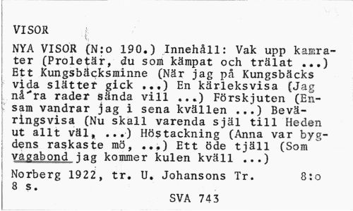 //// VISOR | //// • t. //// NYA VISOR (Nio 190.) Innehåll: Vak upp kamrater (Proletär, du som kämpat och trälat ...) Ett Kungsbäcksminne (När jag på Kungsbäcks vida slätter gick En kärleksvisa (Jag //// nå"ra rader sända vill ...) Förskjuten (Ensam vandrar jag i sena kvällen ...) Bevä-ringsvisa (Nu skall varenda själ till Heden ut allt väl, ...) Höstackning (Anna var bygdens raskaste mö, ..,) Ett öde tjäll (Som vagabond iag kommer kulen kväll ...) //// Norberg 1922, tr. U. Johansons Tr. 8:0 //// 8 s. //// SVA 74 3 ////