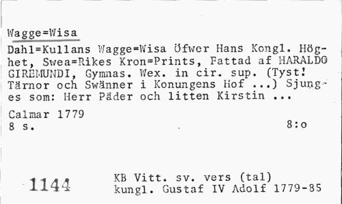 //// Wagge=Wisa //// Dahl=Kullans Wagge=Wisa öfwer Hans Kongl. Höghet, Swea=Rikes Kron=Prints, Fattad af HARALDQ GIREMUNDI, Gymnas. V/ex. in cir. sup. (Tyst.' Tärnor och Swänner i Konungens Hof Sjung- //// es som: Herr Päder och litten Kirstin ... //// Calmar 17 79 //// 8 s. 8:0 //// -t 1 1 5 KB Vitt. sv. vers (tal) //// ' -L-Lfifi kungl. Gustaf IV Adolf 1779-85 ////
