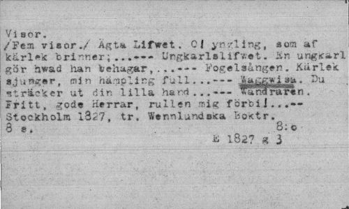 //// Visor. //// /Fem visor./ Ägt*. Lifwet. 01 yngling, a om af karlek brinner;...--- Ungkarlslivet, itn ungirarl //// gör hwad han behagar,...--- Fogslsången. Kurlek //// sjunger, min hämpling full...---lagjgwj^sa. 'Du //// iträcker ut din lilla hand...—- Srarin, Fritt, gode Herrar, rullen mig förbi]...— Stockholm 1327, tr. Wsnnlundska Boktr. 3 e. 8;o //// £ 182? g 3 ////