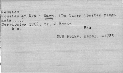 //// Konsten //// Konsten at åka i Wagn, (Du lärer Konsten ringa asrta . ,,) //// Norrköping 1763., tr, .T.Edman //// 6 a . 81 * //// UUB Folkv. kapsl. -17?? ////