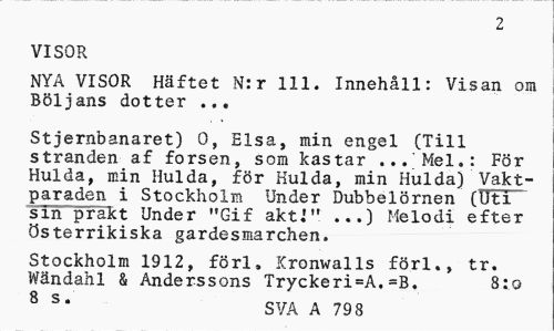 //// 2 //// VISOR //// NYA VISOR Häftet N:r 111. Innehåll: Visan om Böljans dotter ... //// Stjernbanaret) O, Elsa, min engel (Till stranden af forsen, som kastar ...Mel.: För Hulda, min Hulda, för Hulda, min Hulda) Vaktparaden i Stockholm Under Dubbelörnen (Uti sin prakt Under "Gif akti" ...) Melodi efter österrikiska gardesmarchen. //// Stockholm 1912, förl. Xronwalls förl., tr. Wändahl S Anderssons Tryckeri=A.=B. 8:o //// 8 S* SVA A 798 ////