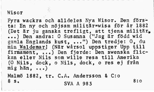 //// Wisor //// Fyra wackra och alldeles Nya Wisor. Den första: En ny och nöjsam militär=wisa för år 1882 (Det är ju ganska trefligt, att tjena militär, ...) Den andra: 0 Susanna ("Jag är född wid gamla Englands kust, ...") Den tredje: O, du min Waldemar! (När wårsol uppstiger Upp till firmament, ...) Den fjerde: Den swenska flickan eller Nils som wille resa till Amerika (0 Nils, dock, o Nils, dock, o res ej från mig hän, ...) //// Malmö 1882 , tr. C.A. Andersson & C:o 8 s* SVA A 983 8:0 ////
